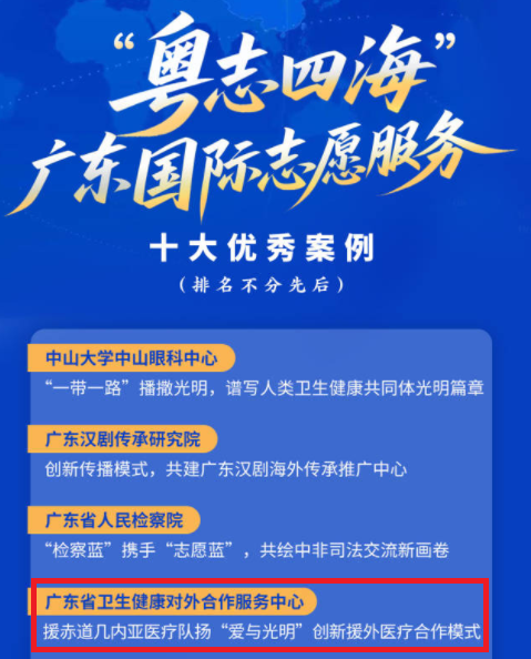 经过综合评审,我中心申报的“援赤道几内亚医疗队扬‘爱与光明’创新援外医疗合作模式”案例,凭借鲜明的海外援助特色、创新的协作机制与扎实的服务成效,成功入选“粤志四海”广东国际志愿服务十大优秀案例。